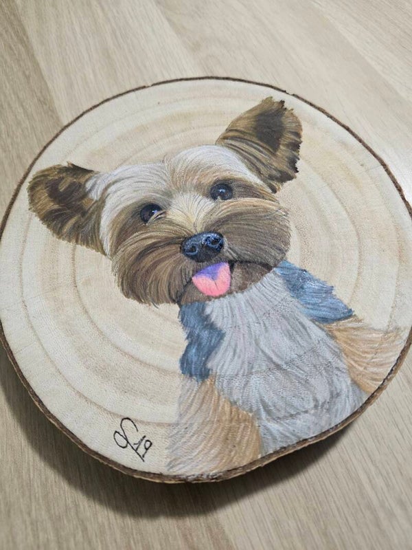 Retrato a color de tu mascota, hecho a mano sobre madera natural de alta calidad.